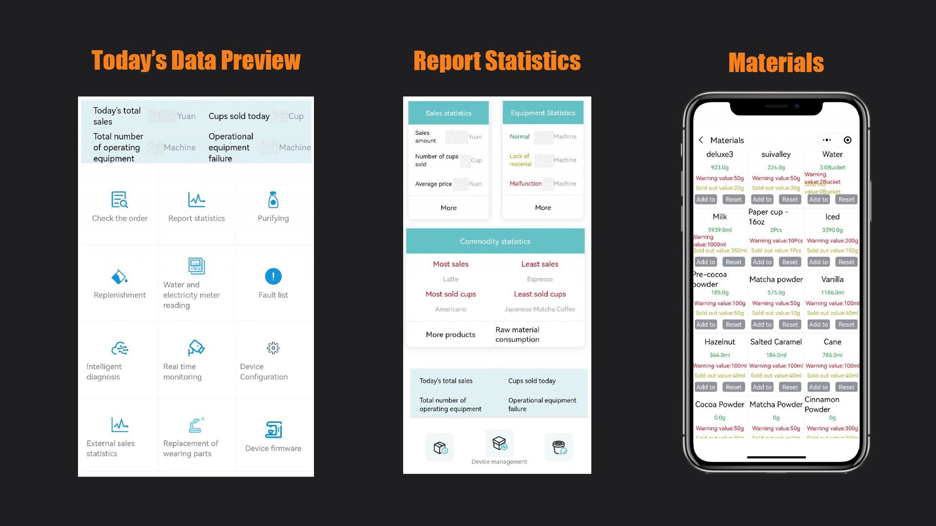 consists of both hardware and software enabling remote access. By integrating seamlessly with AIoT system, you can get the full online access to comprehensive real-time statistics on your cash flow, revenues, and material inventory.You can manage the coffee point from another city or country or even while traveling. Wherever you are, you’ll have full visibility and control of how your robotic barista is working at any moment. All you need is the Internet!